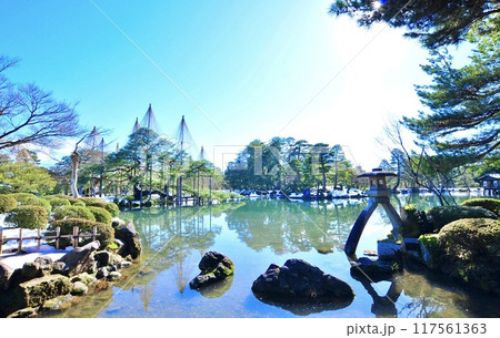 兼六園 雪吊りされた唐崎松が見える風景 石川県金沢市