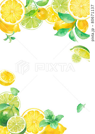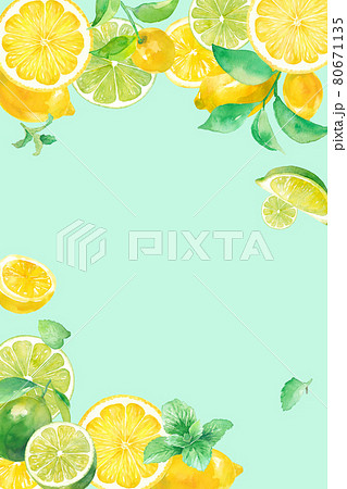 爽やかなシトラスとミントの水彩イラスト。レモンとライムの縦フレームデザイン。