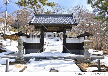 冬の北海道北斗市で慧日山光明寺山門の風景を撮影