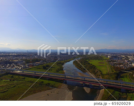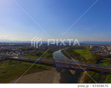 ドローンで上空から空撮した多摩川の上流方向(東京都日野市大字石田)