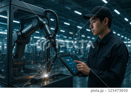 若手作業員がロボット溶接機を監視