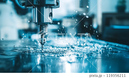 水しぶきが飛ぶ産業用CNC機械による金属切断