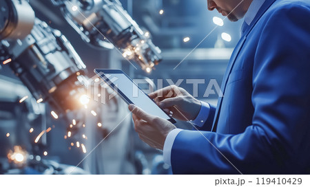 近代的な工場でロボットをタブレットで操作しているエンジニア