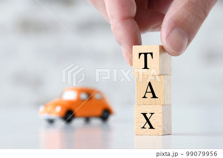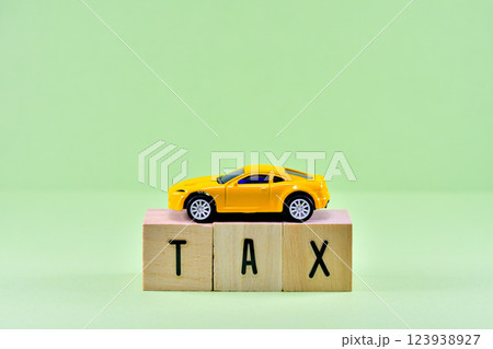 車にかかる税金、自動車税、消費税|「TAX」と書かれた積み木と車のおもちゃとコピースペース