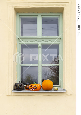 Halloween pumpkins decorating window sill in Banska Stiavnica
