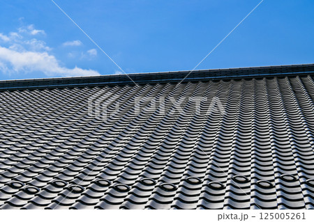 青空に映える日本の伝統的な瓦屋根と鬼瓦の意匠1