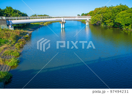 びん沼川 水鏡 河川デッキ 真夏の風景