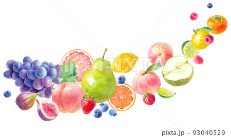 色々なフレッシュフルーツの装飾。水彩イラスト。流れるようなフルーツの集合。フルーツ, 水彩, フレー