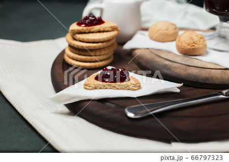 Butter cookies with red jam on a wooden board on a piece of tissue