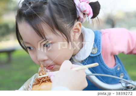 焼きそばパンを食べる3才の女の子