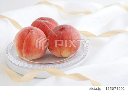 皿に盛られた美味しそうな桃 ゴールドリボンとドレープ布の白背景