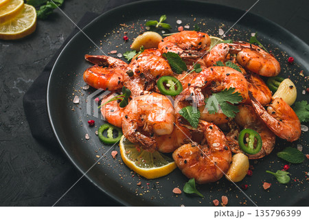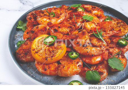 grilled shrimp, unpeeled, headless, with spices, on a marble table, homemade, no people,