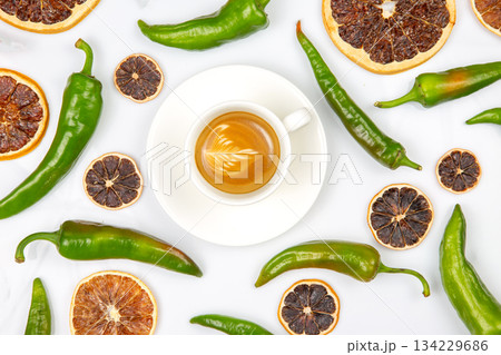 A white cup of cappuccino with foam, surrounded by dried orange slices and green chili peppers