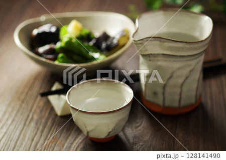 注がれる日本酒と茄子の揚げびたし