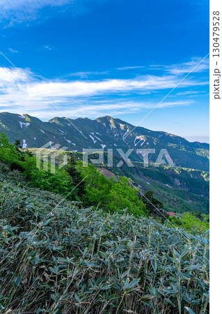砂防新道の甚之助避難小屋から見る大長山 初夏の白山御前峰登山(黒ボコ岩コース)