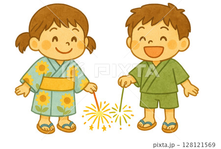 夏祭り・花火大会 浴衣を着た子供たちのイラスト 線あり