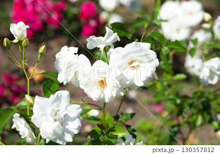Horizontal view of blooming Iceberg Roses from the Floribunda group, elegant white petals and lush blossoms in a vibrant summer garden.