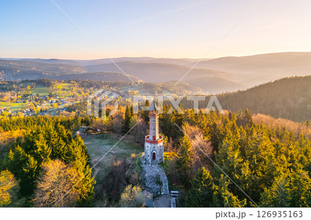 Stepanka Lookout Tower stands gracefully amidst lush spring greenery in Korenov, Czechia. Morning light casts a warm glow over the picturesque landscape and surrounding hills.