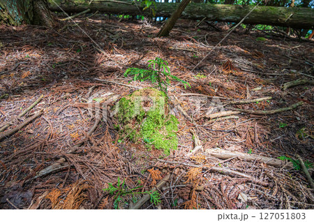 湖北地方の山林風景 地面から生えてきた杉の新芽 滋賀県長浜市