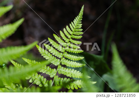 Bright fern fronds shine under gentle sunlight, highlighting intricate leaf patterns. Lush tropical greenery suggests vibrant forest ecosystem, bursting with natural growth and soothing calm