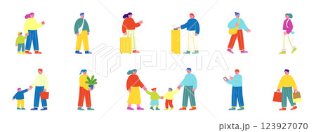沢山の人々のベクターイラストセット。買い物をしたり、親子で出かけている楽しい雰囲気のフラットデザイン