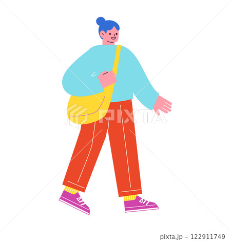 旅行する女性のベクターフラットイラスト。楽しそうに歩くカジュアルなスタイルの女性。