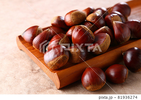 秋の味覚 栗 くり クリ 生栗 茶色の背景