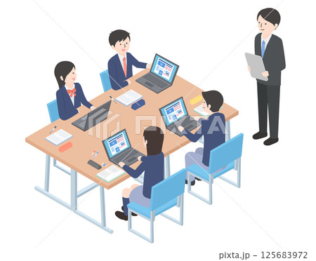 パソコンを使って協働学習をしている生徒とそれを見守る先生