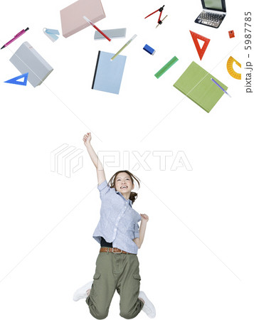 文具と一緒にジャンプする女性