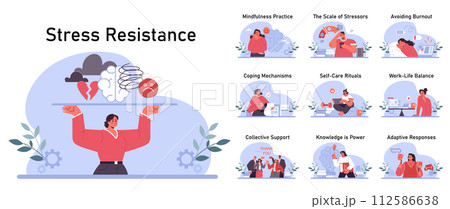 Stress resistance set. Emotional balance and stress resilience skill. Mindfulness practice and work-life balance. Self-care and mental health awareness. Flat vector illustration