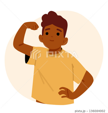 Preteen boy cartoon character flexing muscles standing in motivational pose with feelings of pride