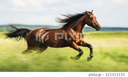 Majestic pale horse galloping across sunlit field at dawn. Copy space, for text. Banner
