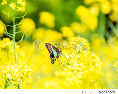 春うらら 満開の菜の花に蜜を吸いに来たアオズジアゲハ蝶