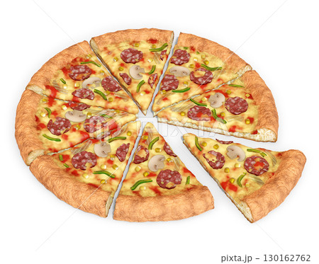 Delicious Italian pizza with salami, tomatoes, and cheese on a plate, isolated on white background