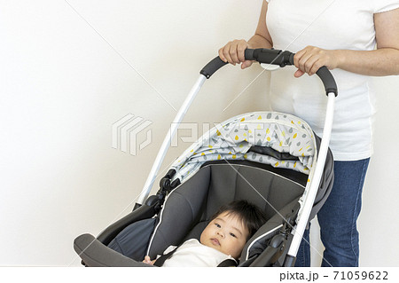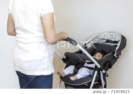 ベビーカーに乗る赤ちゃんと押す母親、生後4か月、女の子