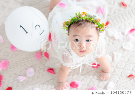 ハーフバースデー ベビードレスを着た生後6ヶ月の赤ちゃん