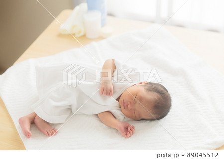 眠る赤ちゃん 新生児 着替えさせるママ 脱がせる 1週