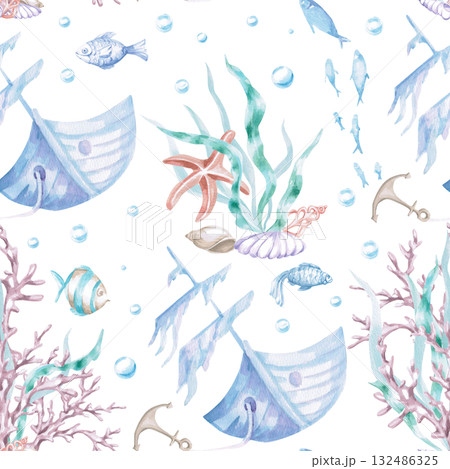 A seamless pattern featuring a sunken ship. Watercolor illustration in a childish style for the design of children's rooms, pools, play areas, and for printing on clothing, fabric, and packaging.