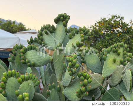 Prickly pear cactus with green fruits in natural outdoor setting. Growth, agriculture and exotic plant life in Mediterranean environment.