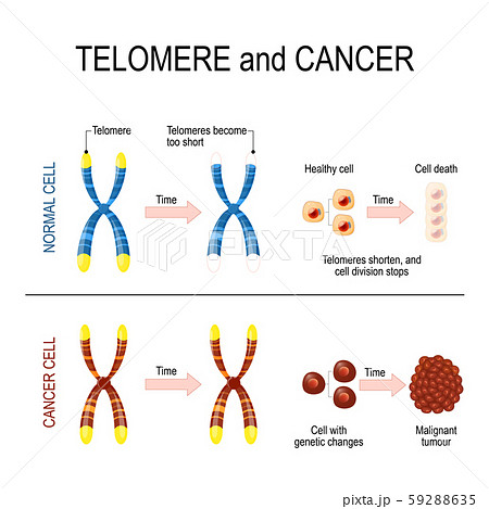 Chromosome and telomere for healthy and cancerous cells. In a normal cell Every time a cell divides, telomeres become shorter. In cancer cells, telomeres remain unchanged.