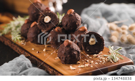 Chocolate round candy sphere with layered white and dark chocolate in section. Chocolate Day, chocoholism. Dessert. sweets sweet life
