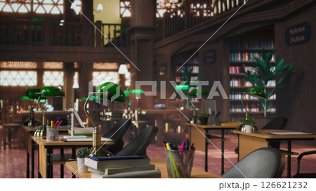 Peaceful empty library featuring wooden shelves and vintage green lamps. The classic architecture and serene study space inspire learning, literacy and intellectual growth. Old fashioned design.