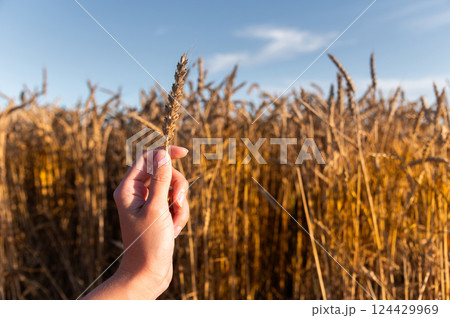 Wheat quality check. Farmer with ears of wheat in a wheat field. Harvesting. Agro business