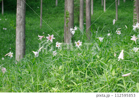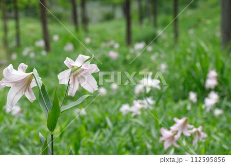 森林と日陰に咲く希少な植物のササユリ。優雅な花びらと後ろ姿
