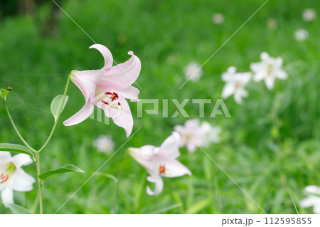 森林と日陰に咲く希少な植物のササユリ。クモの糸がついている