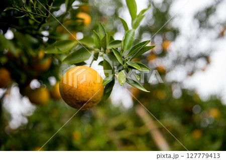 Business farm orange concept nature fruit citrus orchard mandarin tree growing, vibrant organic lush leaves background farmer green garden crop leaf ripe laden branches plant close up farming growth.