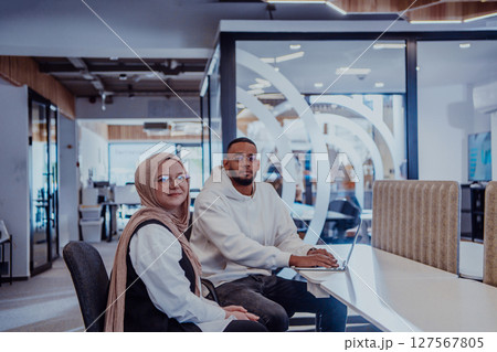 In a modern office setting, an African American businessman and his Muslim colleague, wearing a hijab, engage in collaborative discussions, tackling various business tasks and solving problems