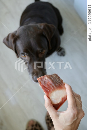 Cute Labrador retriever dog eats fresh meat. pet watches and eats food for breakfast, lunch dinner.