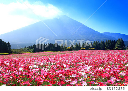 霧島連山を背に満開のコスモス畑