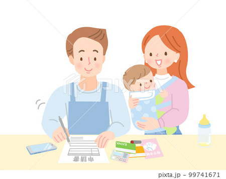 保育園の申請書を書くパパと赤ちゃんを抱っこしたママ